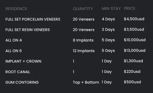 You will have your full porcelain veneers included 20 units, full private transportation, 4 days and 3 nights of a hotel stay and full X-rays for your treatment.